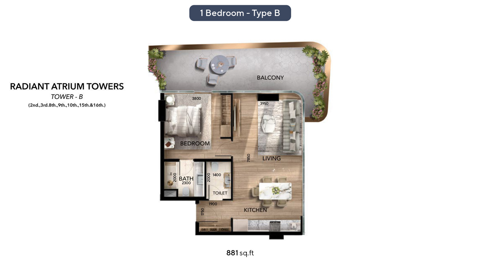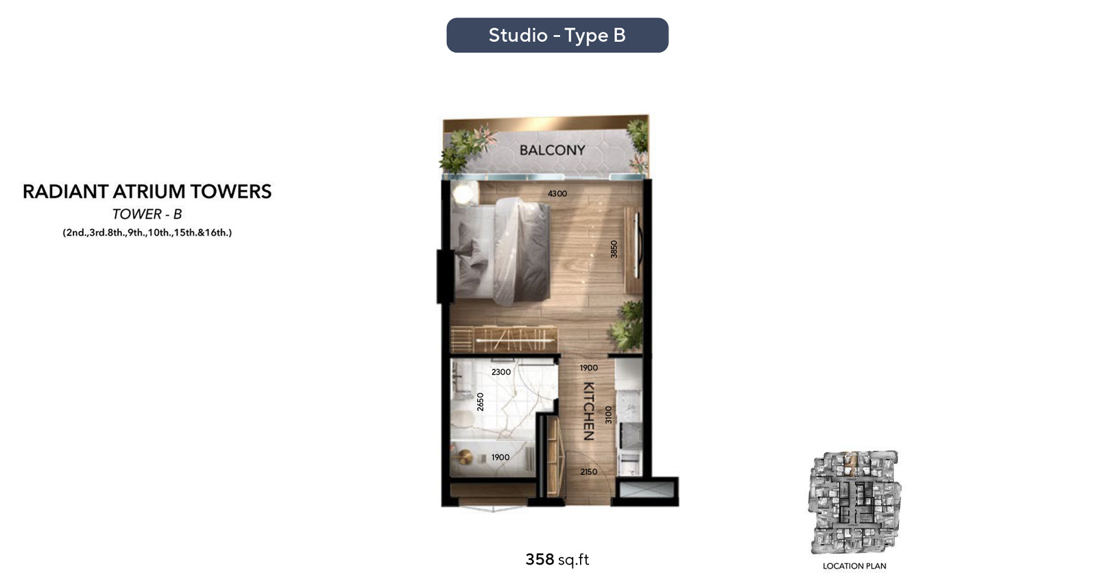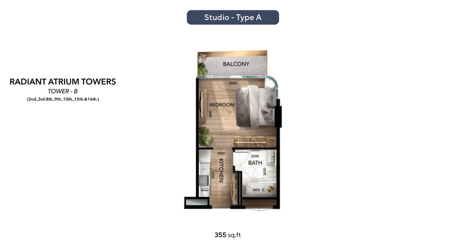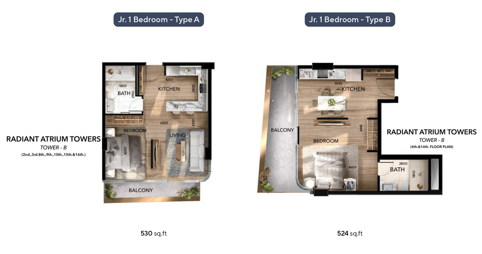 Atrium Residence (Tower B) offers a diverse mix of studios, junior 1-bedroom, 1-bedroom, and 2-bedroom apartments, designed to maximize natural light and functionality. Apartment sizes range from 355 sq.ft to 1,703 sq.ft, catering to young professionals, couples, and families.