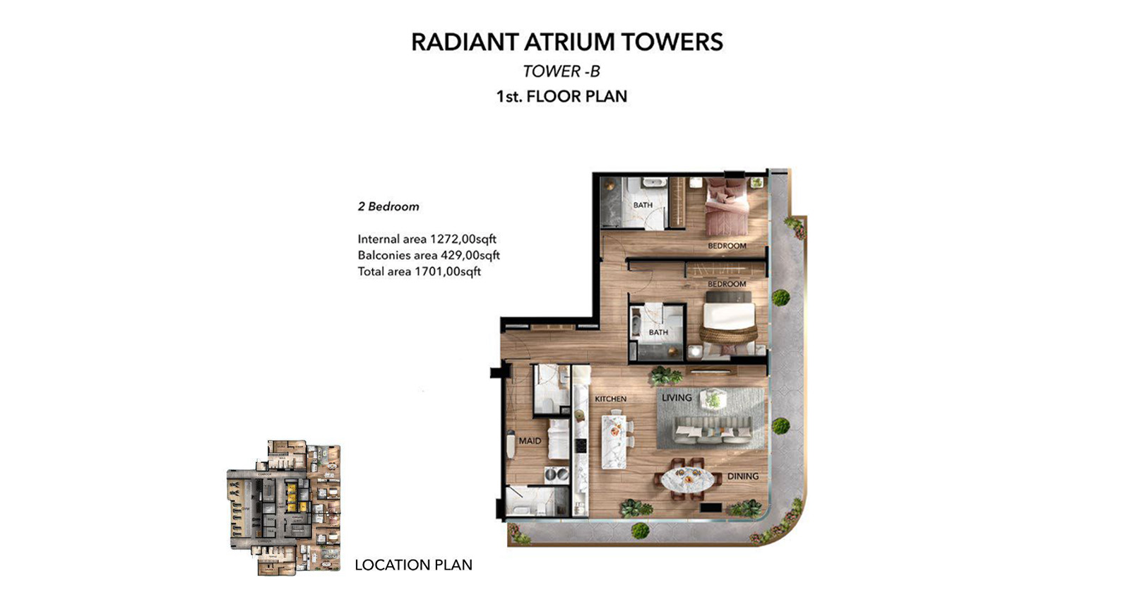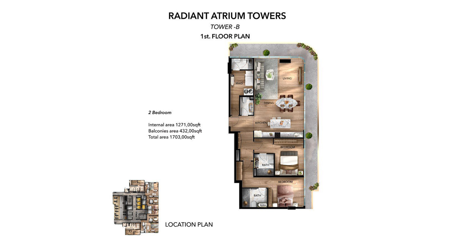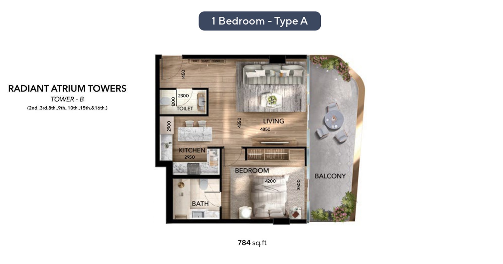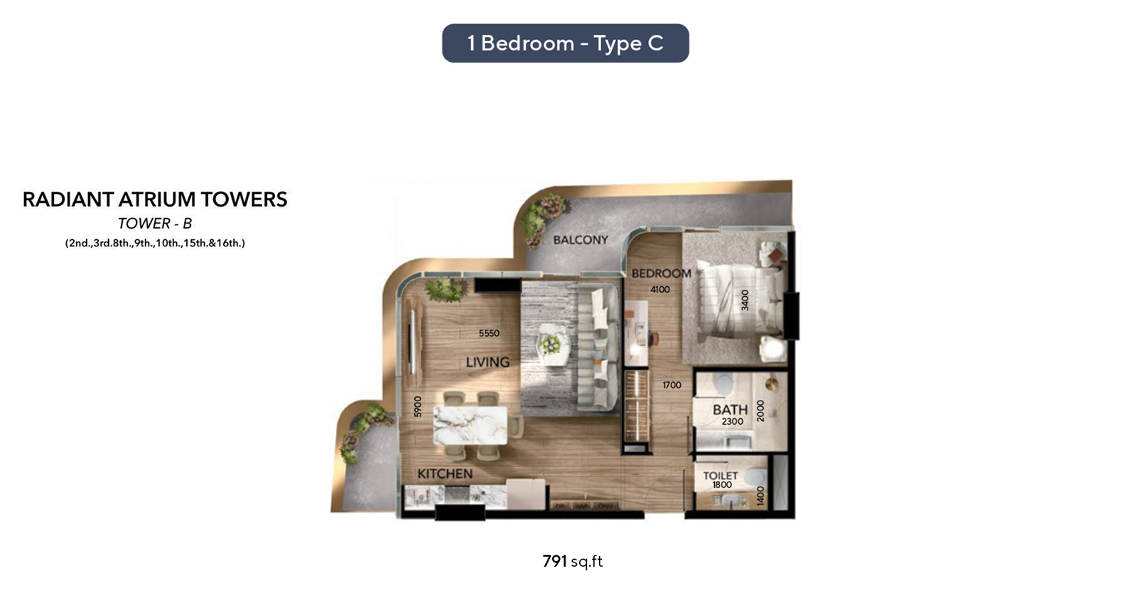 Atrium Residence (Tower B) offers a diverse mix of studios, junior 1-bedroom, 1-bedroom, and 2-bedroom apartments, designed to maximize natural light and functionality. Apartment sizes range from 355 sq.ft to 1,703 sq.ft, catering to young professionals, couples, and families.