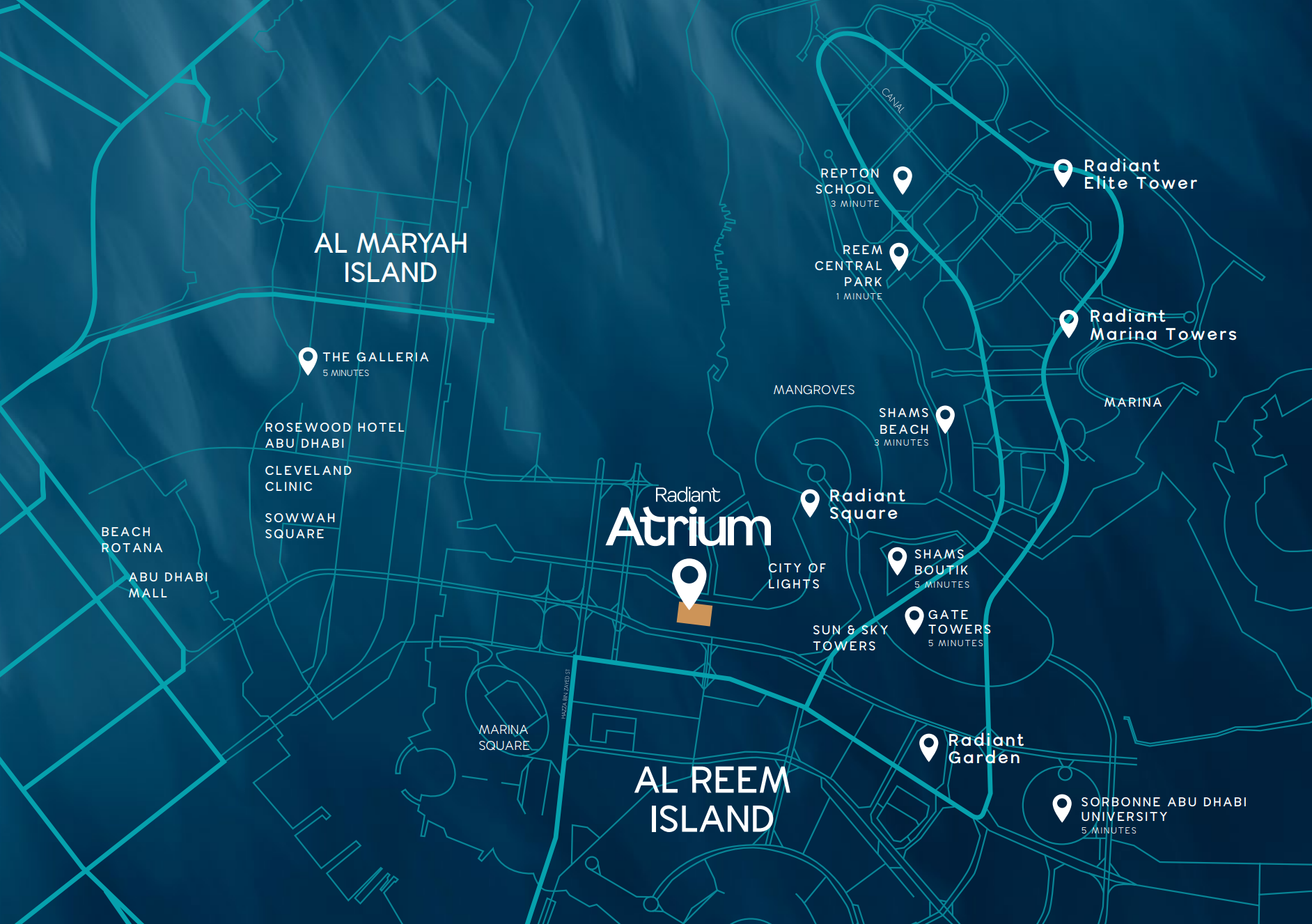 Radiant Atrium on Al Reem Island, Abu Dhabi, is ideally located with seamless access to cultural, educational, retail, and recreational destinations, offering the perfect blend of city convenience and waterfront tranquility.