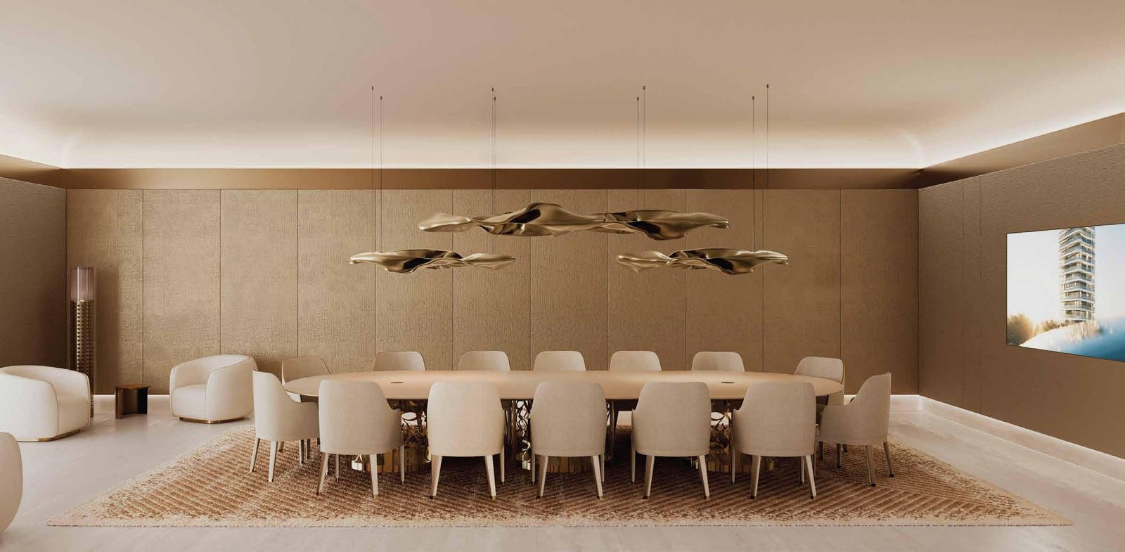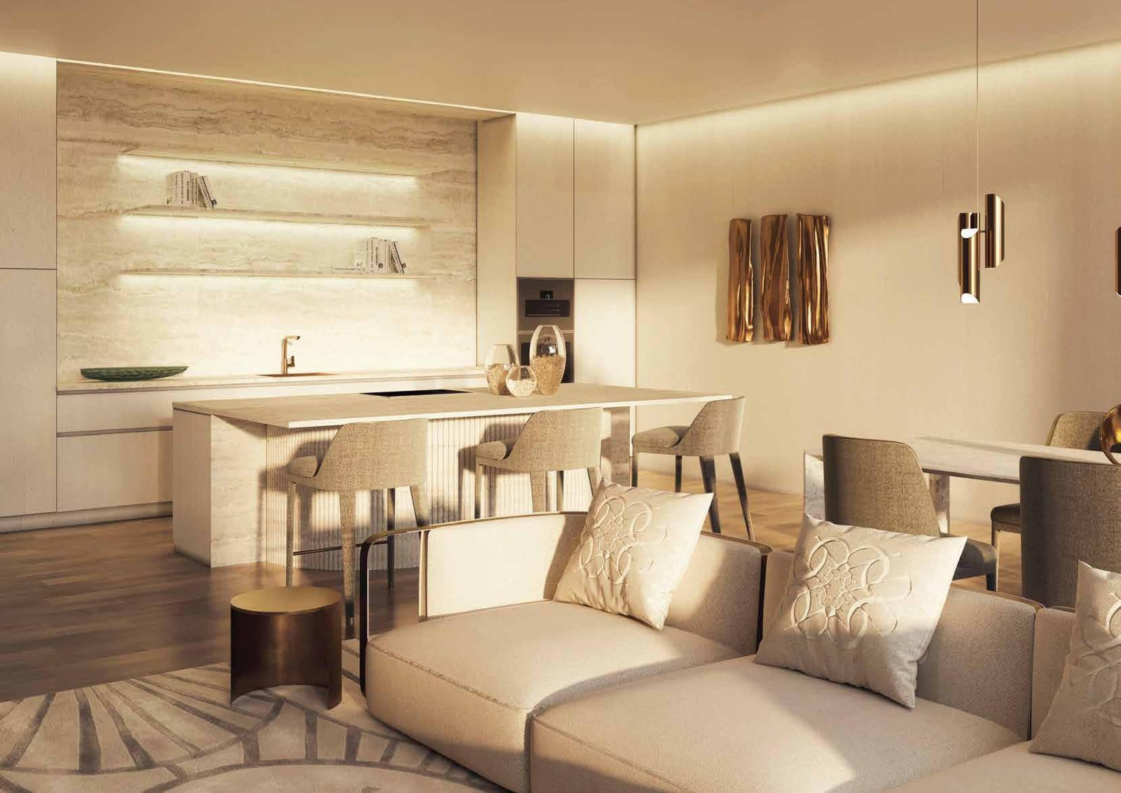 The architecture of Stellar by Elie Saab showcases sculpted lines, graceful geometry, and smooth transitions between interior and exterior spaces. Interiors, curated by Elie Saab Maison, reflect Mediterranean influences with Parisian elegance. Premium materials such as white travertine, light oak, and brushed gold accents create a timeless aesthetic, while bespoke furniture and custom lighting reinforce the project’s commitment to luxury and design.