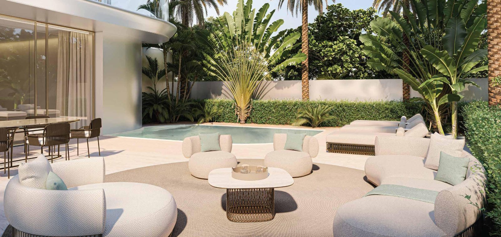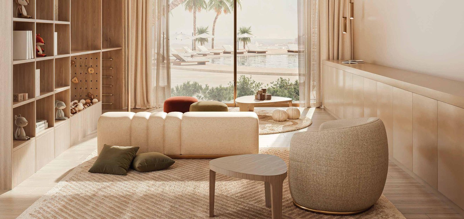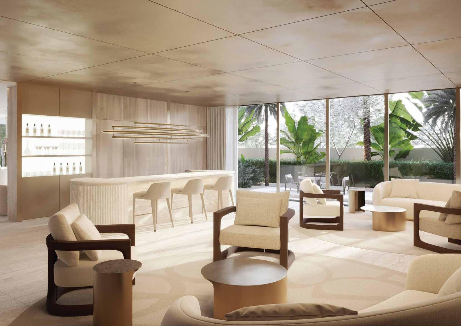 The architecture of Stellar by Elie Saab showcases sculpted lines, graceful geometry, and smooth transitions between interior and exterior spaces. Interiors, curated by Elie Saab Maison, reflect Mediterranean influences with Parisian elegance. Premium materials such as white travertine, light oak, and brushed gold accents create a timeless aesthetic, while bespoke furniture and custom lighting reinforce the project’s commitment to luxury and design.